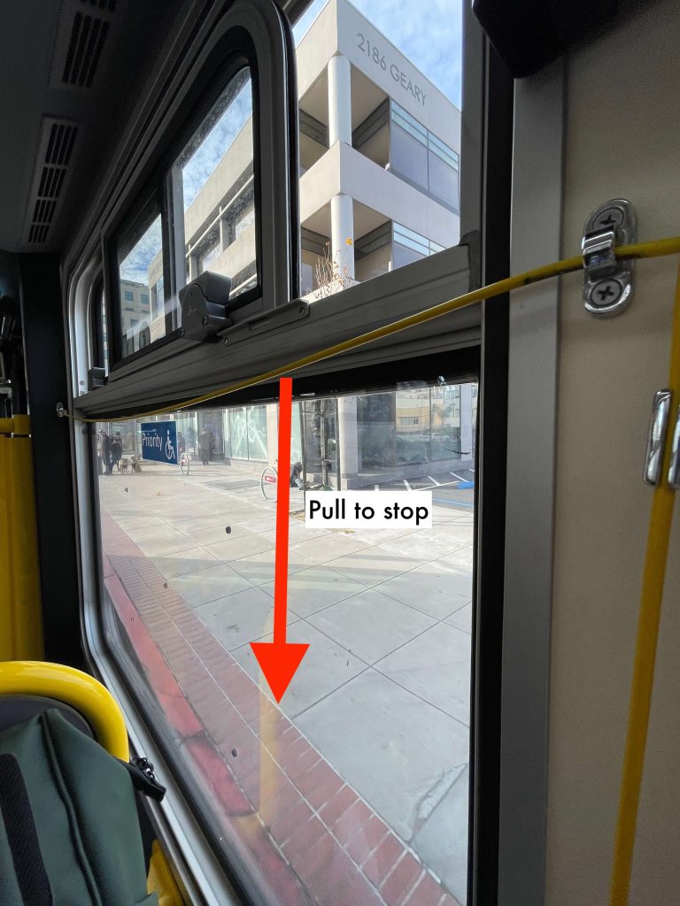 48 hours later, I was in a public bus in San Francisco headed to the Golden Gate bridge viewing deck and saw people pulling the yellow cable cord along the windows to request a stop (image above). I am used to seeing those red buttons with the word “STOP” in buses that this yellow cord was quite unusual. Now, the question is, what if I was alone in the bus, would I have known that this is the “stop” mechanism? No! There were no signs telling me how to do it. Something like below would have been helpful.